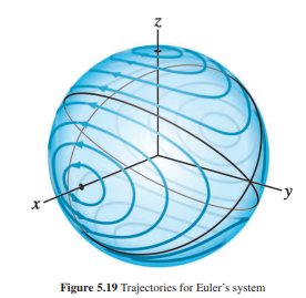 (a) Show that each trajectory of this system lies on the surface of a (possibly degenerate) sphere centered at the origin (0, 0, 0).[Hint: Compute\(\frac{{\bf{d}}}{{{\bf{dt}}}}{\bf{(}}{{\bf{x}}^{\bf{2}}}{\bf{ + }}{{\bf{y}}^{\bf{2}}}{\bf{ + }}{{\bf{z}}^{\bf{2}}}{\bf{)}}\)What does this say about the magnitude of the angular velocity vector?