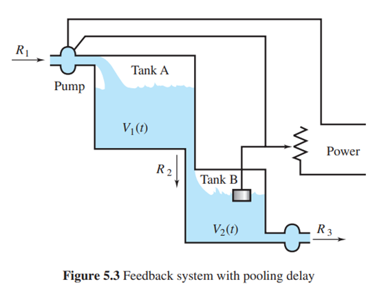 Feedback System with Pooling Delay. Many physical and biological systems involve time delays. A pure time delay has its output the same as its input but shifted in time. A more common type of delay is pooling delay. An example of such a feedback system is shown in Figure 5.3 on page 251. Here the level of fluid in tank B determines the rate at which fluid enters tank A. Suppose this rate is given by where and V are positive constants and is the volume of fluid in tank B at time t.