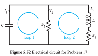 In the electrical circuit of Figure\({\bf{5}}{\bf{.52}}\), take\({{\bf{R}}_{\bf{1}}}{\bf{ = }}{{\bf{R}}_{\bf{2}}}{\bf{ = 1\Omega ,C = 1\;F}}\), and\({\bf{L = 1H}}\). Derive three equations for the unknown currents\({{\bf{I}}_{\bf{1}}}{\bf{,}}{{\bf{I}}_{\bf{2}}}\), and \({{\bf{I}}_{\bf{3}}}\) by writing Kirchhoff's voltage law for loops \({\bf{1}}\)and\({\bf{2}}\), and Kirchhoff's current law for the top juncture. Find the general solution.