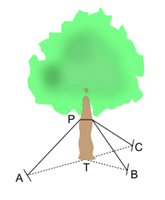 A young tree on level ground is supported at P by three wires of equal length. The wires are staked to the ground at points A, B, and C, which are equally distant from the base of the tree, T. Explain in a paragraph how you can prove that the angles the wires make with the ground are all congruent.