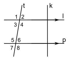 Name the two lines and the transversal that form each pair of angles.