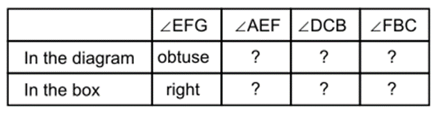 If you measure with a protractor you get more than . But you know that represents a right angle in a box. Using this as an example, complete the table.