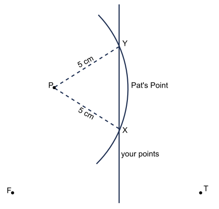 Point X is equidistant from F and T. Furthermore, point Y is equidistant from F and T. Does that mean that X and Y are equally distant from F?