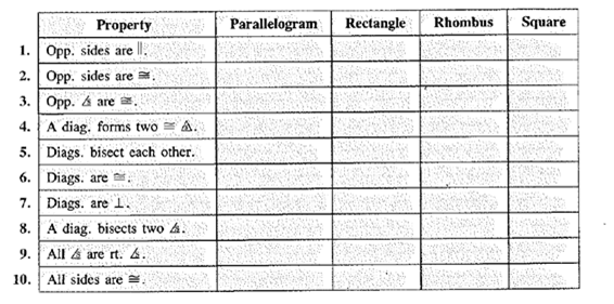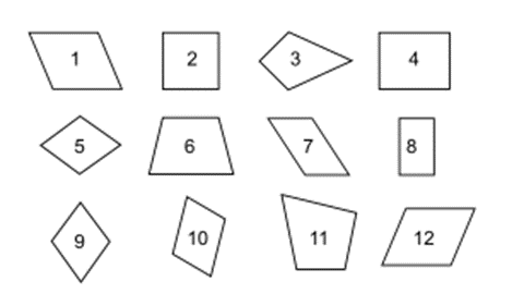For the following figure, name each figure that is (a) a parallelogram (b) a rectangle (c) a rhombus (d) a square.