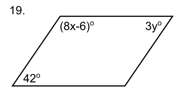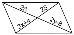Each figure in Exercises 19-24 is a parallelogram with its diagonals drawn. Find the values of x and y.