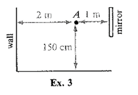 A person with eyes at A, 150 cm above the floor, faces a mirror 1 m away. The mirror extends 30 cm above eye level. How high can the person see on a wall 2 m behind point A?