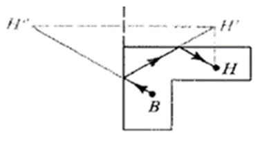 In the two-wall shot illustrated at the right, a reflection in one wall maps H to , and a reflection in a second wall (extended) maps to . To roll the ball from B to H, you aim for . Show that the total distance travelled by the ball equals the distance .