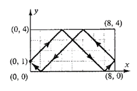 A ball rolls at a angle away from one side of the billiard table that has a coordinate grid on it. If the ball starts at the point it will eventually return to its starting point. Would this happen if the ball started from other points on the y-axis between and ?