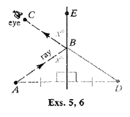 Show that the light ray follows the shortest possible path from A and C via the mirror by proving that for any point E on the mirror (other than B) . (Hint: See the Application: Finding the Shortest Path, on page 224.)