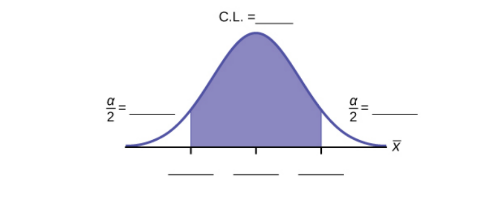 Fill in the blanks on the graph with the areas, upper and lower limits of the confidence interval, and the sample mean.
