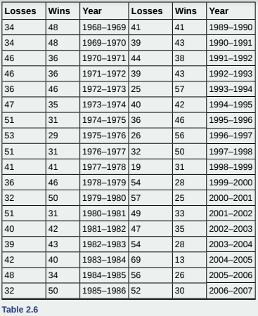 The table shows the number of wins and losses the Atlanta Hawks have had in seasons. Create a side-by-side stem-and-leaf plot of these wins and losses.