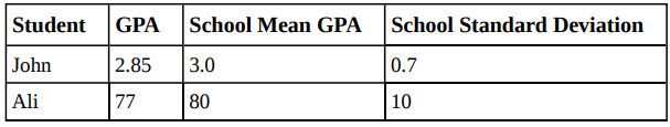 Two students, John and Ali, from different high schools, wanted to find out who had the highest GPA when compared to his school. Which student had the highest GPA when compared to his school?