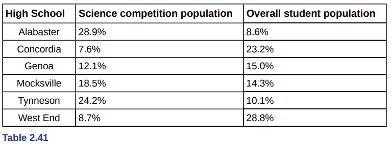 David County has six high schools. Each school sent students to participate in a county-wide science competition. Table shows the percentage breakdown of competitors from each school, and the percentage of the entire student population of the county that goes to each school. Construct a bar graph that shows the population percentage of competitors from each school.