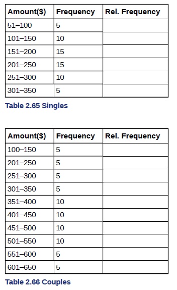 f. Answers may vary. Possible answers include: Although the width of the class intervals for couples is double that of the class intervals for singles, the graphs are more similar than they are different.