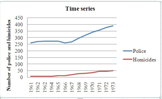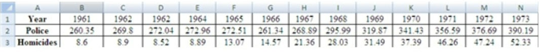 The following data sets list full time police per citizens along with homicides per citizens for the city of Detroit, Michigan during the period from