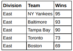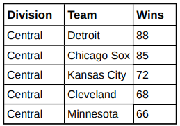 The American League and the National League of Major League Baseball are each divided into three divisions: East, Central, and West. Many years, fans talk about some divisions being stronger (having better teams) than other divisions. This may have consequences for the postseason. For instance, in Tampa Bay won games and did not play in the postseason, while Detroit won only and did play in the postseason. This may have been an oddity, but is there good evidence that in the season, the American League divisions were significantly different in overall records? Use the following data to test whether the mean number of wins per team in the three American League divisions were the same or not. Note that the data are not balanced, as two divisions had five teams, while one had only four