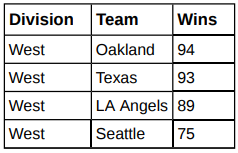 The American League and the National League of Major League Baseball are each divided into three divisions: East, Central, and West. Many years, fans talk about some divisions being stronger (having better teams) than other divisions. This may have consequences for the postseason. For instance, in Tampa Bay won games and did not play in the postseason, while Detroit won only and did play in the postseason. This may have been an oddity, but is there good evidence that in the season, the American League divisions were significantly different in overall records? Use the following data to test whether the mean number of wins per team in the three American League divisions were the same or not. Note that the data are not balanced, as two divisions had five teams, while one had only four
