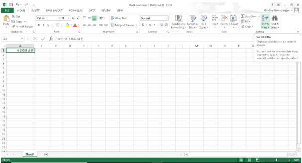 After this step let us find the r-value using TDISTfunction in excel.