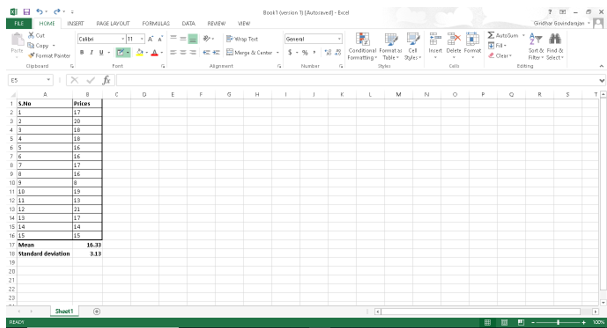 Here \(\bar{X}\) is the sample mean and \(\mu\) is the population mean, \(s\) is the standard deviation and n is the sample size. Now the randomly chosen \(15\) prices from appendix C is entered in Excel to calculate mean and standard deviation. The mean is calculated using the function =average ( ) and the standard deviation is calculate using the function =stdev ( ).