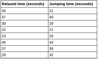At Rachel’s \(11th\) birthday party, eight girls were timed to see how long (in seconds) they could hold their breath in a relaxed position. After a two-minute rest, they timed themselves while jumping. The girls thought that the mean difference between their jumping and relaxed times would be zero. Test their hypothesis.