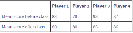 A golf instructor is interested in determining if her new technique for improving players' golf scores is effective. She takes four new students. She records their 18 -hole scores before learning the technique and then after having taken her class. She conducts a hypothesis test. The data are as follows.