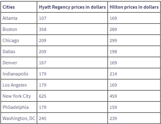 A traveler wanted to know if the prices of hotels are different in the ten cities that he visits the most often. The list of the cities with the corresponding hotel prices for his two favorite hotel chains is in Table 10.33. Test at the level of significance.