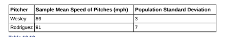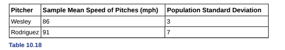 Use the following information to answer the next five exercises. The mean speeds of fastball pitches from two different baseball pitchers are to be compared. A sample of 14 fastball pitches is measured from each pitcher. The populations have normal distributions. Table 10.18 shows the result. Scouters believe that Rodriguez pitches a speedier fastball.