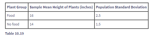 Use the following information to answer the next five exercises. A researcher is testing the effects of plant food on plant growth. Nine plants have been given the plant food. Another nine plants have not been given the plant food. The heights of the plants are recorded after eight weeks. The populations have normal distributions. The following table is the result. The researcher thinks the food makes the plants grow taller.