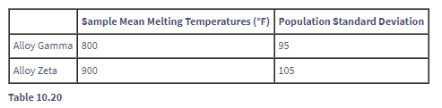 Use the following information to answer the next five exercises. Two metal alloys are being considered as material for ball bearings. The mean melting point of the two alloys is to be compared. 15 pieces of each metal are being tested. Both populations have normal distributions. The following table is the result. It is believed that Alloy Zeta has a different melting point.