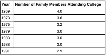 The average number of people in a family that attended college for various years is given in Table 12.29.