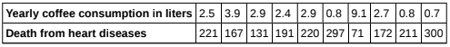 The following table shows data on average per capita coffee consumption and heart disease rate in a random sample of \(10\) countries.