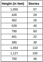 The height (sidewalk to roof) of notable tall buildings in America is compared to the number of stories of the building (beginning at street level).
