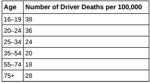 Recently, the annual number of driver deaths per \(100,000\) for the selected age groups was as follows: