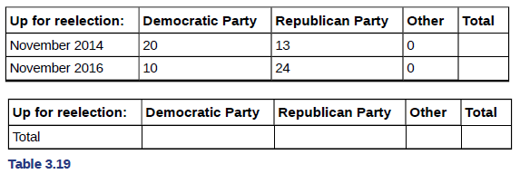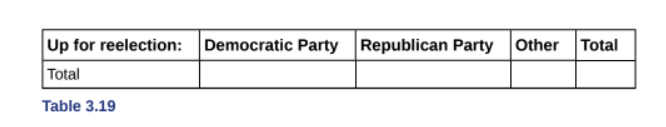 Use the information in the Tableto answer the next eight exercises. The table shows the political party affiliation of each of localid="1649516803996" members of the US Senate In June localid="1649516807155" . and when they are up freelection.