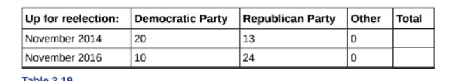 Use the information in the Table to answer the next eight exercises. The table shows the political party affiliation of each of members of the US Senate In June . and when they are up freelection.