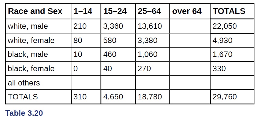 Table 3.20 gives the number of suicides estimated in the U.S. for a recent year by age, race (black or white), and sex. We are interested in possible relationships between age, race, and sex. We will let suicide victims be our population.