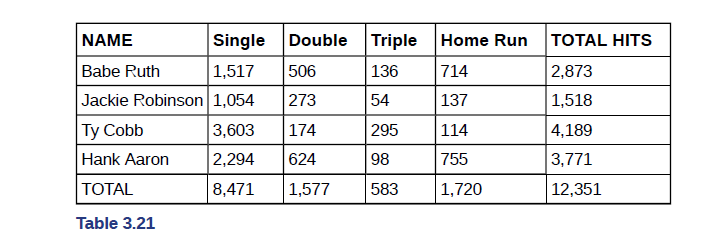 Use the following information to answer the next two exercises. The table of data obtained from www.baseball-almanac.com shows hit information for four well-known baseball players. Suppose that one hit from the table is randomly selected.
