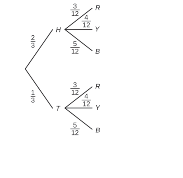 Use the following information to answer the next two exercises. This tree diagram shows the tossing of an unfair coin followed by drawing one bead from a cup containing three red (R), four yellow (Y) and five blue (B) beads. For the coin, and where H is heads and T is tails.