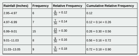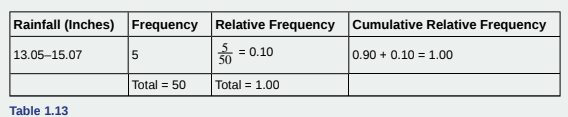 Table 1.13 represents the amount, in inches, of annual rainfall in a sample of towns. What fraction of towns