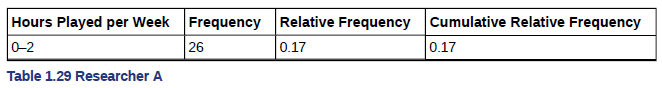 Use the following data to answer the next five exercises: Two researchers are gathering data on hours of video games played by school-aged children and young adults. They each randomly sample different groups of 150 students from the same school. They collect the following data.