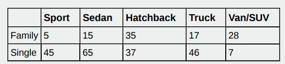 Do families and singles have the same distribution of cars? Use a level of significance of . Suppose that randomly selected families and randomly selected singles were asked what type of car they drove: sport, sedan, hatchback, truck, van/SUV. The results are shown in Table Do families and singles have the same distribution of cars? Test at a level of significance of .