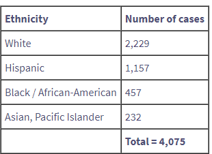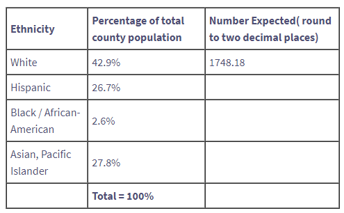 Use the following information to answer the next nine exercise: The following data are real. the cumulative number of AIDS cases reported for Santa Clary Country is broken down by ethnicity as in table 11.29