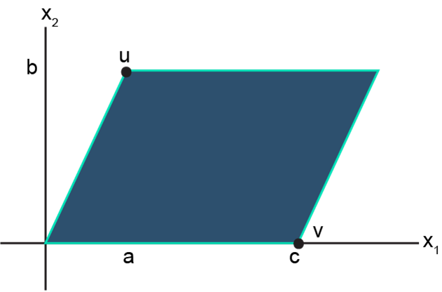 Let \(u = \left[ {\begin{aligned}{*{20}{c}}a\\b\end{aligned}} \right]\), and \(v = \left[ {\begin{aligned}{*{20}{c}}c\\{\bf{0}}\end{aligned}} \right]\), where a, b, and c are positive integers (for simplicity). Compute the area of the parallelogram determined by u, v, \({\bf{u}} + {\bf{v}}\), and 0, and compute the determinant of \(\left[ {\begin{aligned}{*{20}{c}}{\bf{u}}&{\bf{v}}\end{aligned}} \right]\), and \[\left[ {\begin{aligned}{*{20}{c}}{\bf{v}}&{\bf{u}}\end{aligned}} \right]\]. Draw a picture and explain what you find.