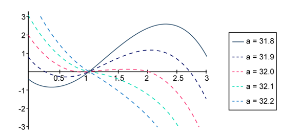 Question: Let \(A = \left( {\begin{array}{*{20}{c}}{ - 6}&{28}&{21}\\4&{ - 15}&{ - 12}\\{ - 8}&a&{25}\end{array}} \right)\). For each value of \(a\) in the set \(\left\{ {32,31.9,31.8,32.1,32.2} \right\}\), compute the characteristic polynomial of \(A\) and the eigenvalues. In each case, create a graph of the characteristic polynomial \(p\left( t \right) = \det \left( {A - tI} \right)\) for \(0 \le t \le 3\). If possible, construct all graphs on one coordinate system. Describe how the graphs reveal the changes in the eigenvalues of \(a\) changes.