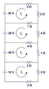 \(\begin{array}{c}\left[ {\begin{array}{*{20}{c}}{{r_1}}&{{r_2}}&{{r_3}}&{{r_4}}\end{array}} \right]\left[ {\begin{array}{*{20}{c}}{{I_1}}\\{{I_2}}\\{{I_3}}\\{{I_4}}\end{array}} \right] = \left[ v \right]\\\left[ {\begin{array}{*{20}{c}}4&{ - 1}&0&0\\{ - 1}&6&{ - 2}&0\\0&{ - 2}&{10}&{ - 3}\\0&0&{ - 3}&{12}\end{array}} \right]\left[ {\begin{array}{*{20}{c}}{{I_1}}\\{{I_2}}\\{{I_3}}\\{{I_4}}\end{array}} \right] = \left[ {\begin{array}{*{20}{c}}{40}\\{30}\\{20}\\{10}\end{array}} \right]\end{array}\)