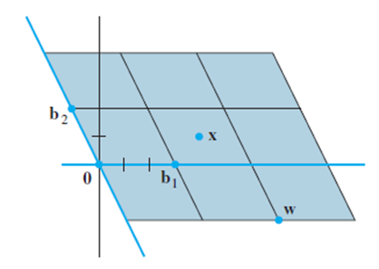 Let \({b_1} = \left[ {\begin{array}{*{20}{c}}3\\0\end{array}} \right]\), \({b_2} = \left[ {\begin{array}{*{20}{c}}{ - {\bf{1}}}\\{\bf{2}}\end{array}} \right]\), \({\bf{w}} = \left[ {\begin{array}{*{20}{c}}{\bf{7}}\\{ - {\bf{2}}}\end{array}} \right]\), \({\bf{x}} = \left[ {\begin{array}{*{20}{c}}{\bf{4}}\\{\bf{1}}\end{array}} \right]\), and \(B = \left\{ {{b_1},{b_2}} \right\}\). Use the figure to estimate \({\left[ {\bf{w}} \right]_B}\) and \({\left[ {\bf{x}} \right]_B}\). Confirm your estimate of \({\left[ {\bf{x}} \right]_B}\) by using it and \(\left\{ {{b_1},{b_2}} \right\}\)to compute x.