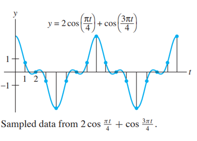 Let \(\left\{ {{y_k}} \right\}\) be the sequence produced by sampling the continuous signal \({\bf{2cos}}\frac{{\pi t}}{{\bf{4}}} + {\bf{cos}}\frac{{{\bf{3}}\pi t}}{{\bf{4}}}\) at \(t = {\bf{0}},\,{\bf{1}},\,{\bf{2}},\,......\)as shown in the figure. The values of \({y_k}\), beginning with \(k = {\bf{0}}\), are