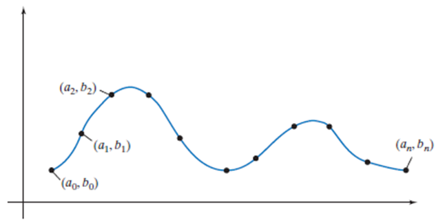 Cubic splines. Suppose you are in charge of the design of a roller coaster ride. This simple ride will not make any left or right turns; that is, the track lies in a vertical plane. The accompanying figure shows the ride as viewed from the side. The points are given to you, and your job is to connect the dots in a reasonably smooth way. Let .