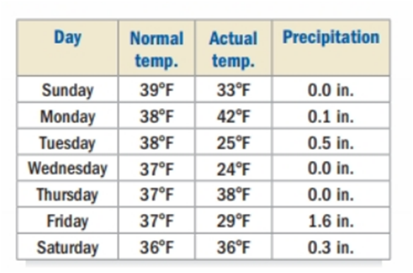 Temperature To find the departure from normal temperature, you can use the expression a–n, where a is the actual average temperature for the day and n is the normal, or average, temperature historically. Use the table below to find the departure from normal temperature for each day. Then find the mean departure from normal temperature for the week.