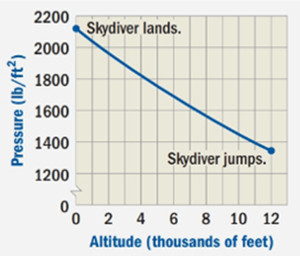A skydiver uses an altimeter to track altitude so that he or she knows when to open the parachute. The altimeter determines altitude by measuring changes in atmospheric pressure. The graph below shows how pressure varies with altitude as a skydiver falls from 12,000 feet to ground level. (The elevation of the ground is assumed to be 0 feet with respect to sea level.)